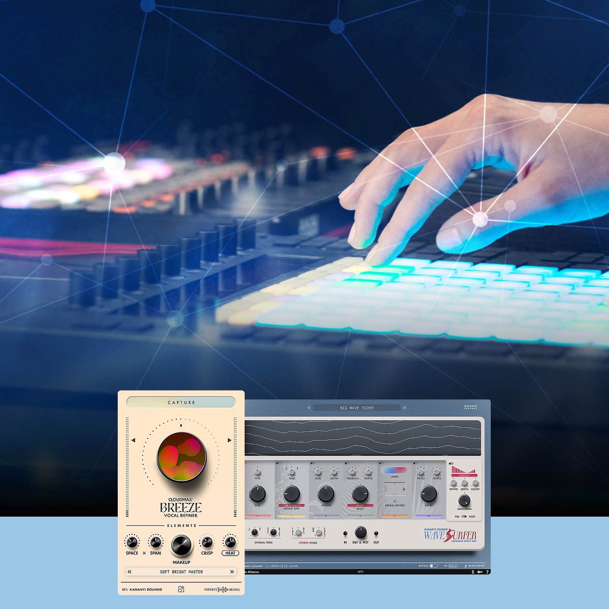 Yes. Some of our plugins include Karanyi Sounds's Assistive AI System that analyzes your track with one click and automatically sets the right parameters based on tempo, tone, style, and mood. In Wavesurfer the AI adjusts the reverbs for you, in Cloudmax Breeze it builds an entire vocal chain automatically, and in Playmod sets the reverb parameters to match your sound.